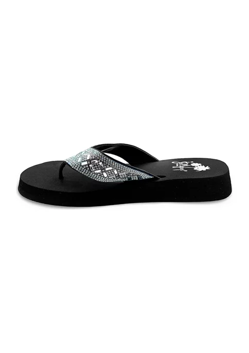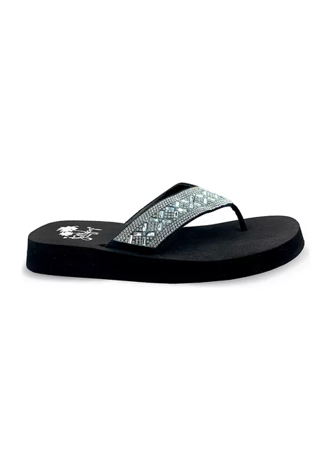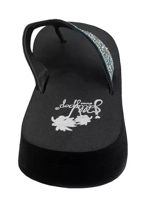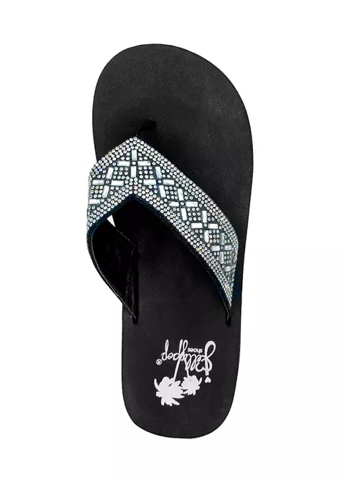 EVA flip flop with lots of bling. Bejeweled and sparkly faux stone adorn this thing’s upper. Soft EVA bottom with lots of sparkles.