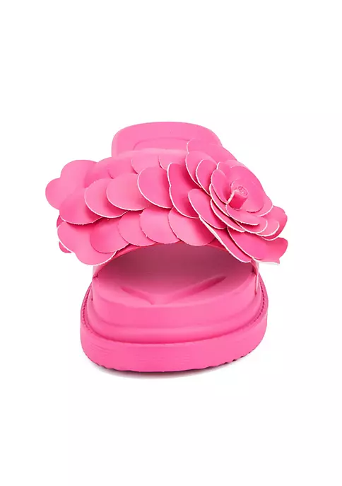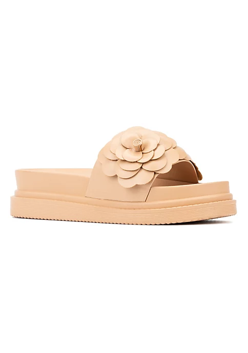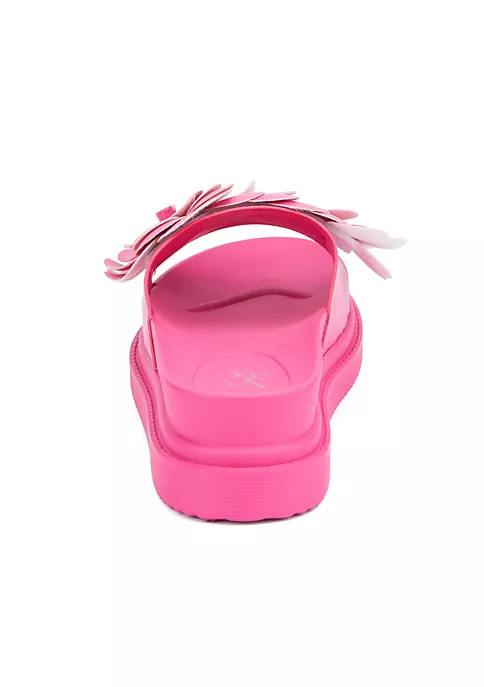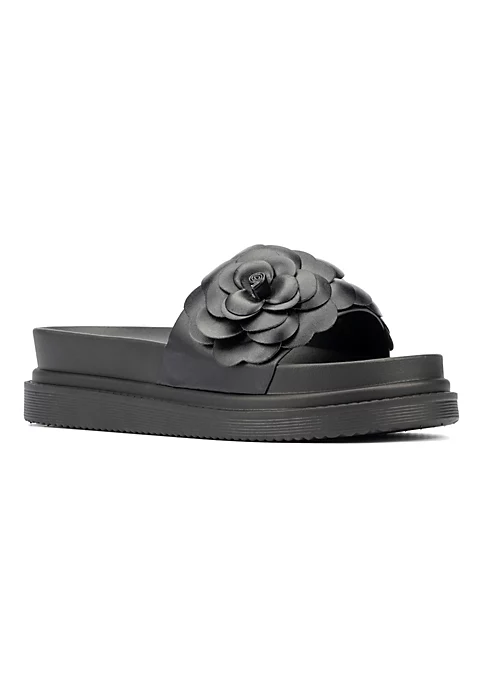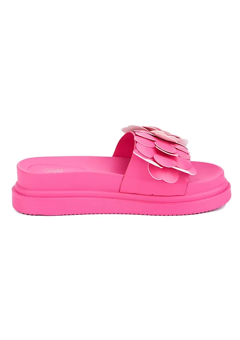 This pair of slides feature a unique appeal with flower applique that is eye-catching yet also comfortable for walking. Upper: 100% Faux Leather, Outsole: 100% Polyvinyl Chloride , Lining: 100% Polyvinyl Chloride Heel Height: 2″