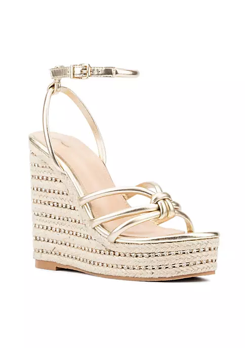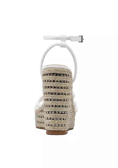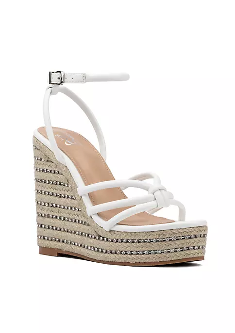 Standout wearing this chic wedge sandal with rhinestone embellishments. These stylish sandals would look great with your skirts and summer dresses. Upper: 100% Faux Leather, Outsole: 100% Thermoplastic Rubber, Lining: 100% Thermoplastic Rubber Heel Height: 4.75″