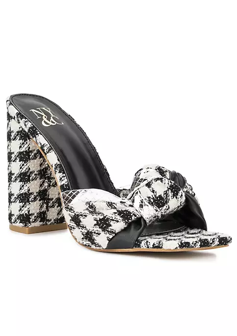 Slide in the stylish Anthi open heels. This backless design features a houndstooth or animal print, square toe, knot décor and covered blocked heel. Upper: 100% Faux Suede Outsole: 70% Rubber, 30% Textile Lining: 100% Faux Leather Heel height: 3.9″