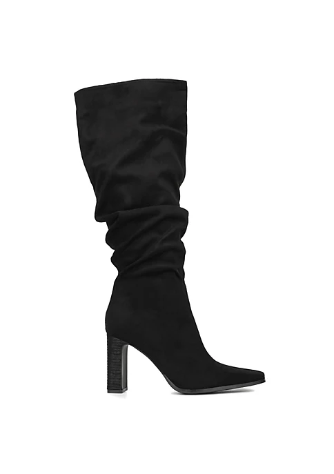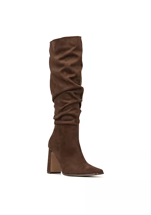 Featuring a block heel and side zipper, the Damaris slouched boot is the perfect style for a cold weather wardrobe. Upper: 100% Faux Suede Outsole: 70% Rubber, 30% Textile Lining: 100% Fabric Heel height: 3.8″ Shaft height: 21″ Shaft circumference: 17.6″