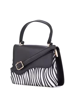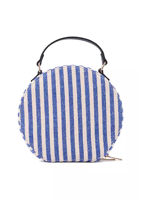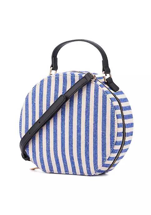 Fall in love with this round striped crossbody. The Freesia crossbody bag features a stand-alone shape, top handle and belt buckle décor.