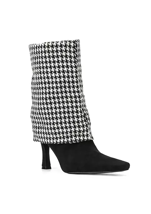 The Kalissa boot features a foldable style, pointed toe structure, side zipper and stiletto heel. Show them off either in leopard or plaid print. Upper: 100% Faux Suede Outsole: 70% Rubber, 30% Textile Lining: 100% Fabric Heel height: 3.3″ Shaft height: 16″ Shaft circumference: 16″