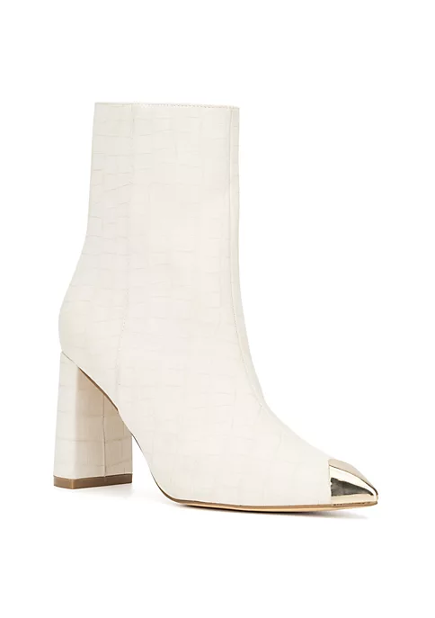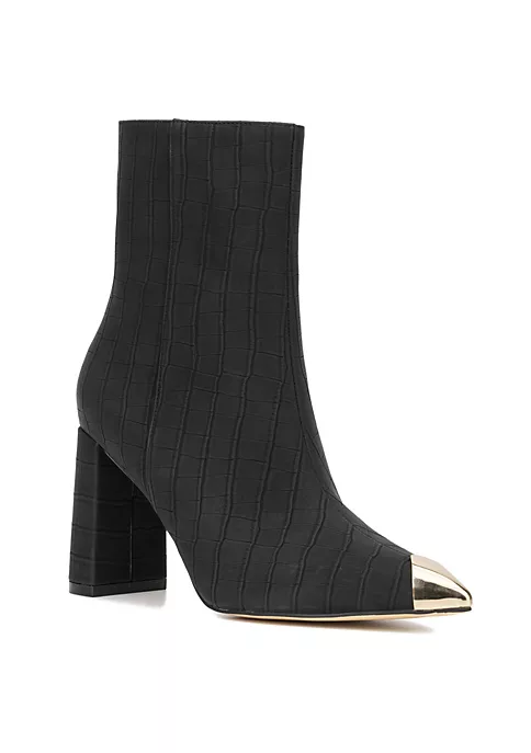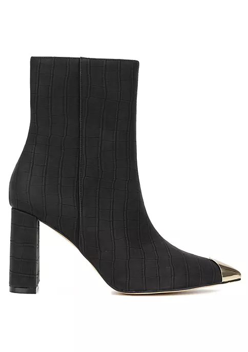Let’s glam up with the Kayla ankle bootie. This pointed toe style features a gold accent, patterned upper, side zip closure and block heel. Upper: 100% Faux Leather Outsole: 100% Rubber Lining: 90% Faux Suede, 10% Faux Leather Heel height: 3.31″ Shaft height: 6.02″ Shaft circumference: 9.65″