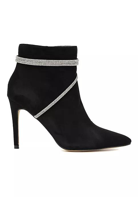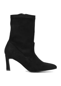 The Georgette pointed bootie has a distinguished sleek profile, stiletto heel and an ankle bracelet accent. Upper: 100% Faux Suede Outsole: 70% Rubber, 30% Textile Lining: 100% Faux Suede Heel height: 3.8″ Shaft height: 4.5″ Shaft circumference: 9.8″