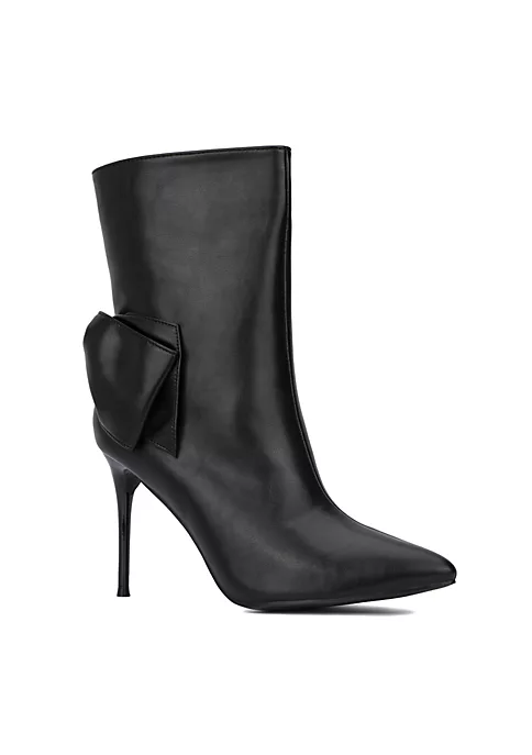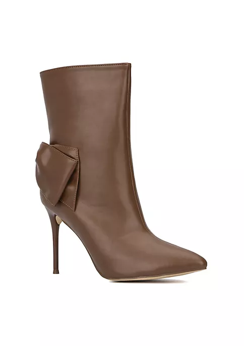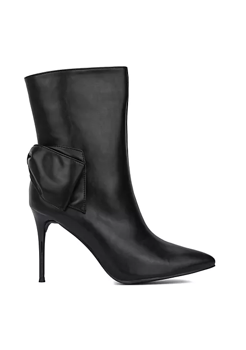 The Mila pointed toe ankle bootie features oversized bow accents on the sides, stiletto heels, and exposed zip closure at sides. Upper: 100% Faux Leather Outsole: 100% Rubber Lining: 80% Faux Suede, 20% Faux Leather Heel height: 3.5″ Shaft height: 6.5″ Shaft circumference: 13″