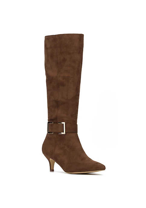 The pointed toe Paula boot was made to dazzle. Featuring a sophisticated design with a kitten heel, buckle accent and side zip closure. Upper: 100% Suede Outsole: 100% Rubber Lining: 80% Faux Suede, 20% Faux Leather Heel height: 2.5″ Shaft height: 15″ Shaft circumference: 14.5″