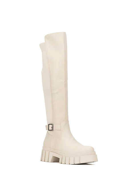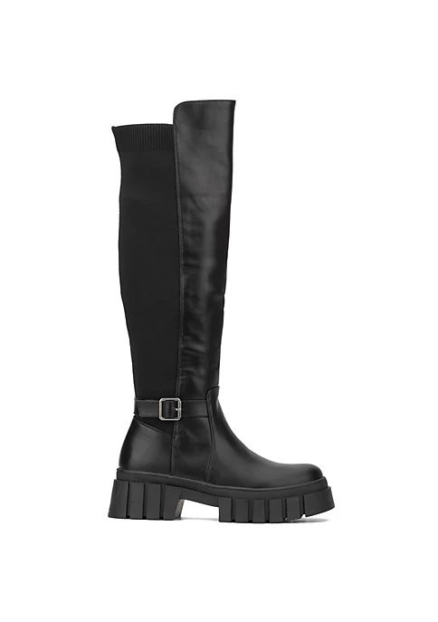 Rock a trendy and edgy style with the Sara tall combat boot. This boot features a chunky lug sole, aesthetic buckle strap, side zipper closure and stretchy back panel. Upper: 60% Faux Leather, 40% Faux Suede Outsole: 100% Thermoplastic Rubber Lining: 95% Fabric, 5% Faux Leather Heel height: 2.55″ Shaft height: 18.5″ Shaft circumference: 14.18″
