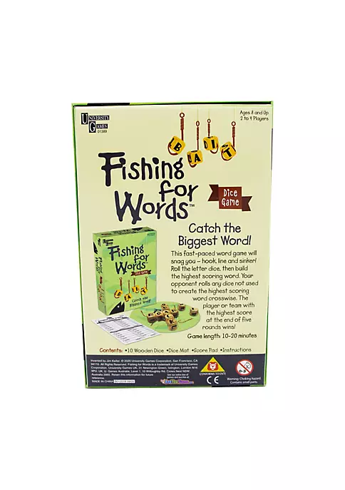 Catch the biggest word! This fast-paced word game will snag you – hook, line, and sinker! Roll the letter dice, then build the highest scoring word. Your opponent rolls any dice not used to create the highest scoring word crosswise. The player or team with the highest score at the end of five rounds wins!